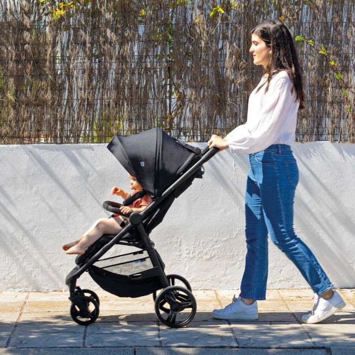 Ventilated side panels keep airflow steady on warmer days, while rear wheel suspension ensures a comfortable ride on a variety of terrains. An extendable hood offers excellent sun protection, and the spacious under-seat basket is perfect for carrying baby essentials on the go.