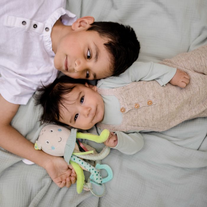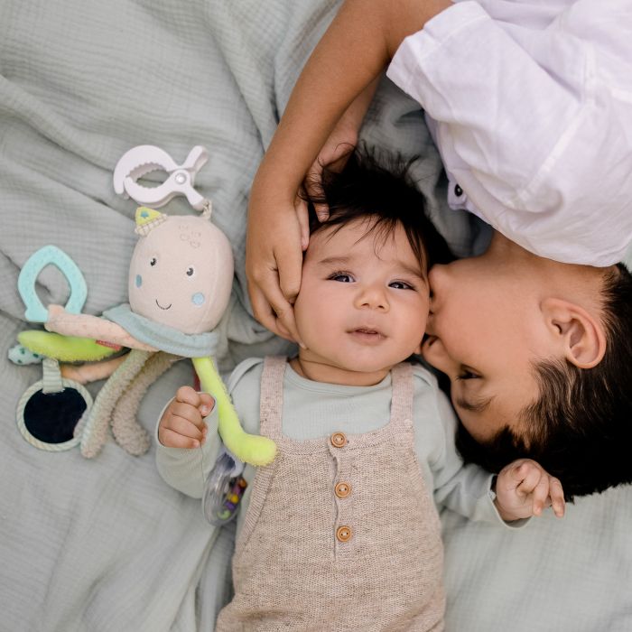 Introducing our delightful Activity Octopus – a captivating companion for your little one’s exploration and playtime. This adorable octopus comes equipped with a variety of toys that dangle, make noise, and are perfect for grasping. With its convenient clamp, you can effortlessly attach it to your pram, baby seat, or bed, ensuring that the fun is always within reach. Designed to capture your baby’s heart, this charming octopus is more than just a toy. It’s a sensory experience that engages and stimulates your baby’s developing senses. The soft colours and appealing pendants invite your little one to play and explore, encouraging sensory exploration and discovery. The grasping elements are specifically designed to train conscious grasping, promoting fine motor skills. But that’s not all – this adorable sea creature offers more than just visual and tactile stimulation. It’s a gateway to learning through play. The soft teether provides relief during the teething phase, soothing your baby’s gums. The gentle rattle ring produces a delightful sound that rewards your baby’s movements, while the mirror adds an element of self-discovery. The use of various materials further enhances your baby’s curiosity, sense of touch, and motor skills. With our Activity Octopus, your little one will be happily engaged wherever they go. Whether it’s playtime at home or on the move, this baby sensory toy ensures hours of joyful exploration. It encourages active learning and fosters the development of essential skills in a fun and interactive way. Made from high-quality materials, our Activity Octopus is built to withstand the rigors of playtime and exploration. It’s a reliable companion that will accompany your little one on their journey of discovery, providing endless opportunities for growth and development.