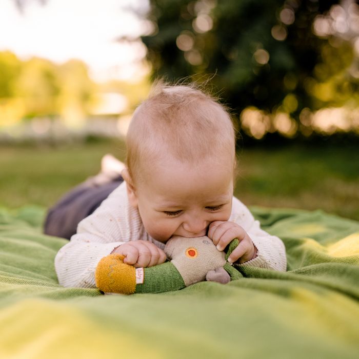 Cuddly grasping toy for rattling, squeaking, touching, playing – a devoted companion for babies and toddlers. This small toy with bright colors, textures and lovely details is the perfect size to take everywhere with you! An ideal present for any occasion and available in 6 different animal types to choose from.