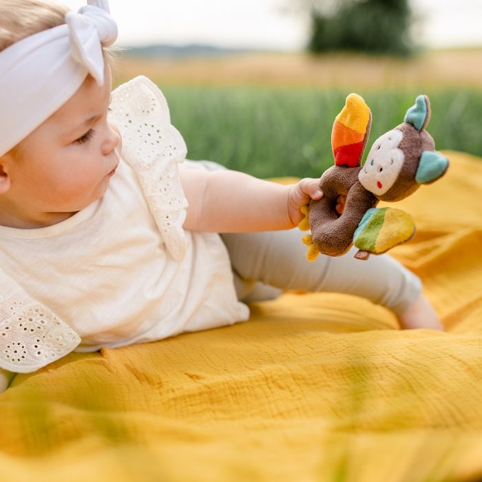 The little ring grabber bad playfully stimulates baby´s sense of hearing, touch and grasping. With the great corduroy material and exciting sound of the integrated rattle, it never gets boring. Babies love the cute fabric bat to grasp, touch, discover & cuddle! The little bat can be taken everywhere and can accompany your baby while playing and dreaming in the cot, in the baby car seat or in the stroller.
